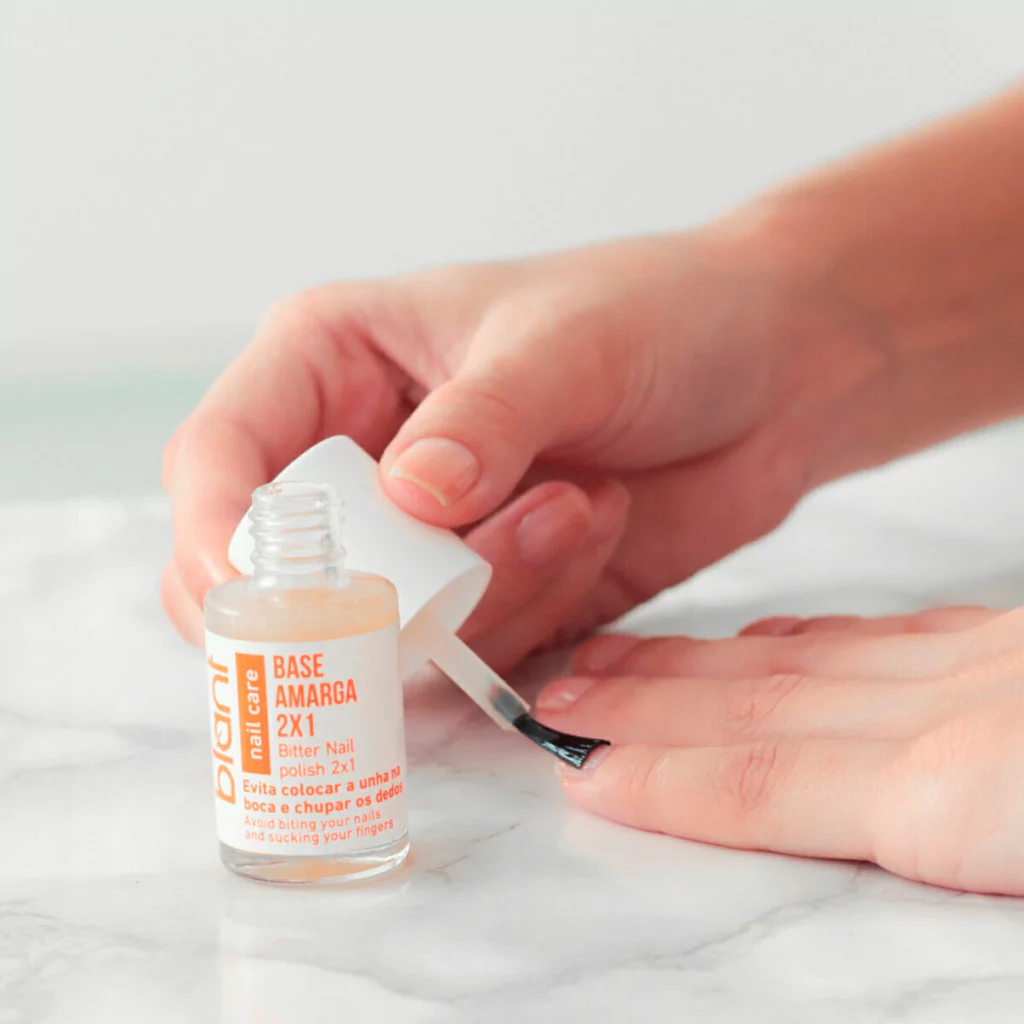 Semanalmente usar a base amarga, aplicar uma fina camada sobre as unhas limpas e reaplicar em até 7 dias.