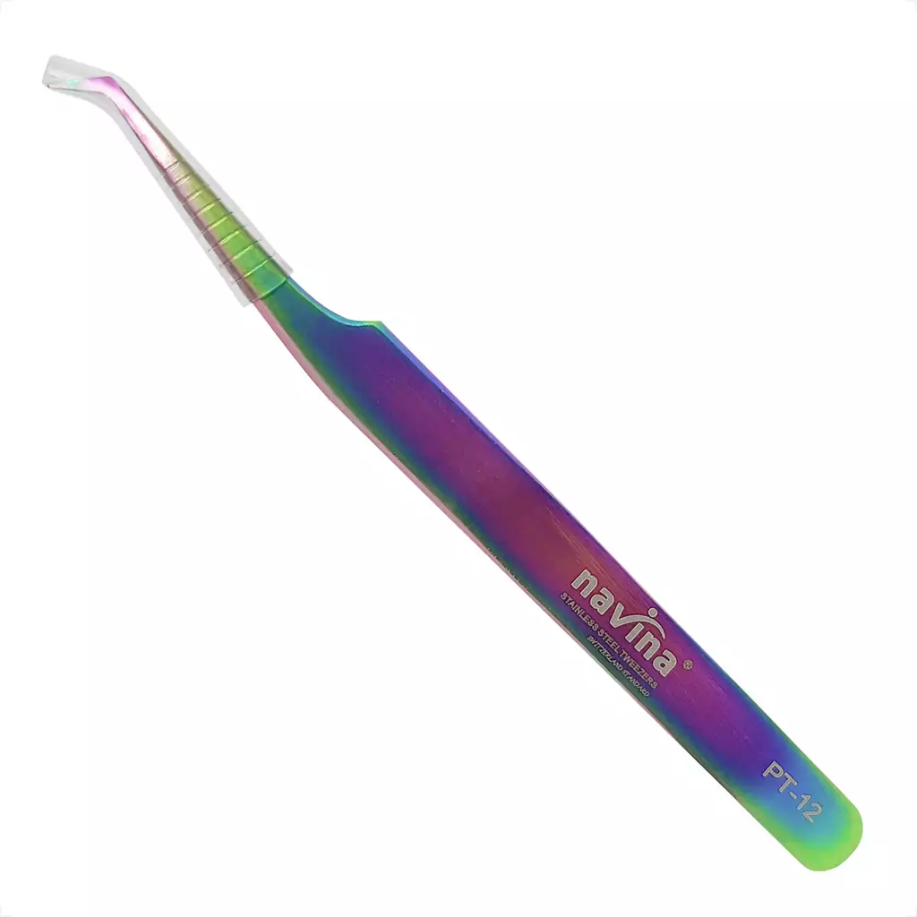 Da marca Navina a pinça é em aço inoxidável com banho multicolorido, ponta curva fina e curta de alta precisão em formato cisne.Ela é anatômica e não cansa as mãos ao operar;