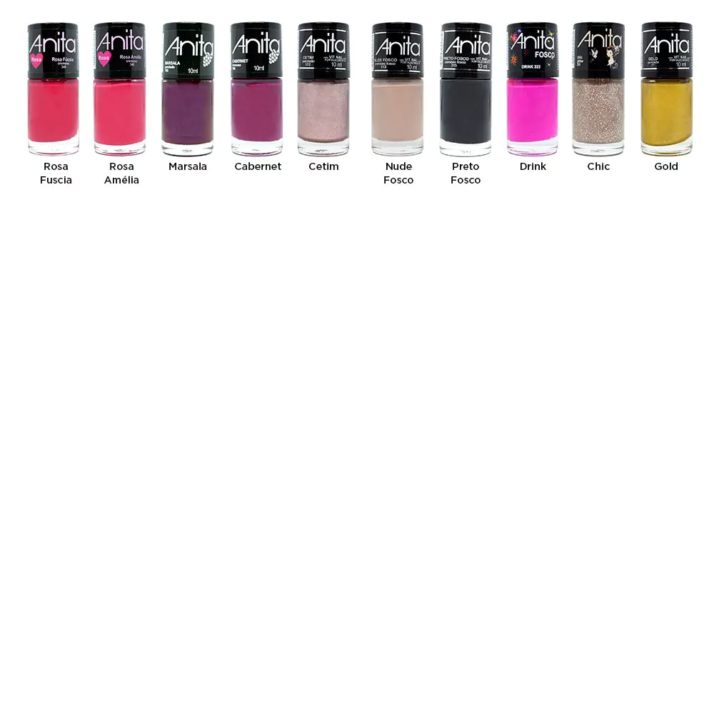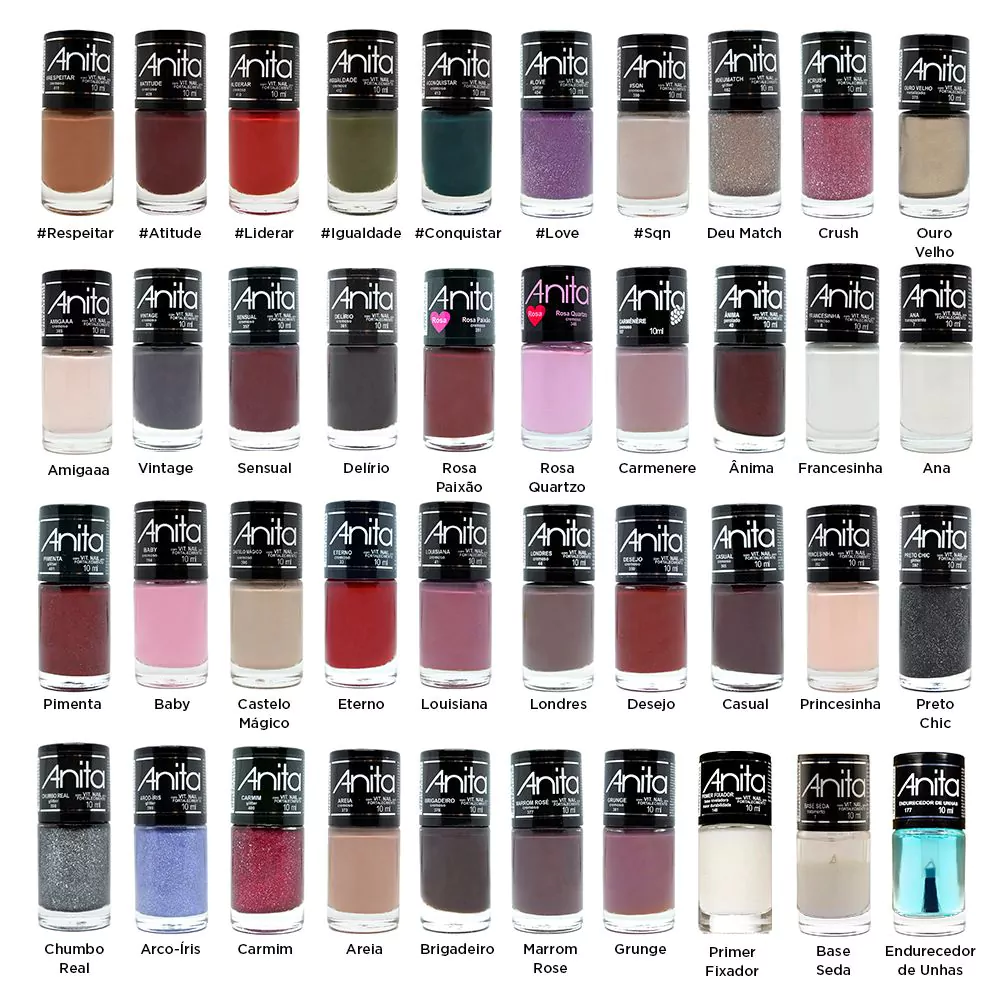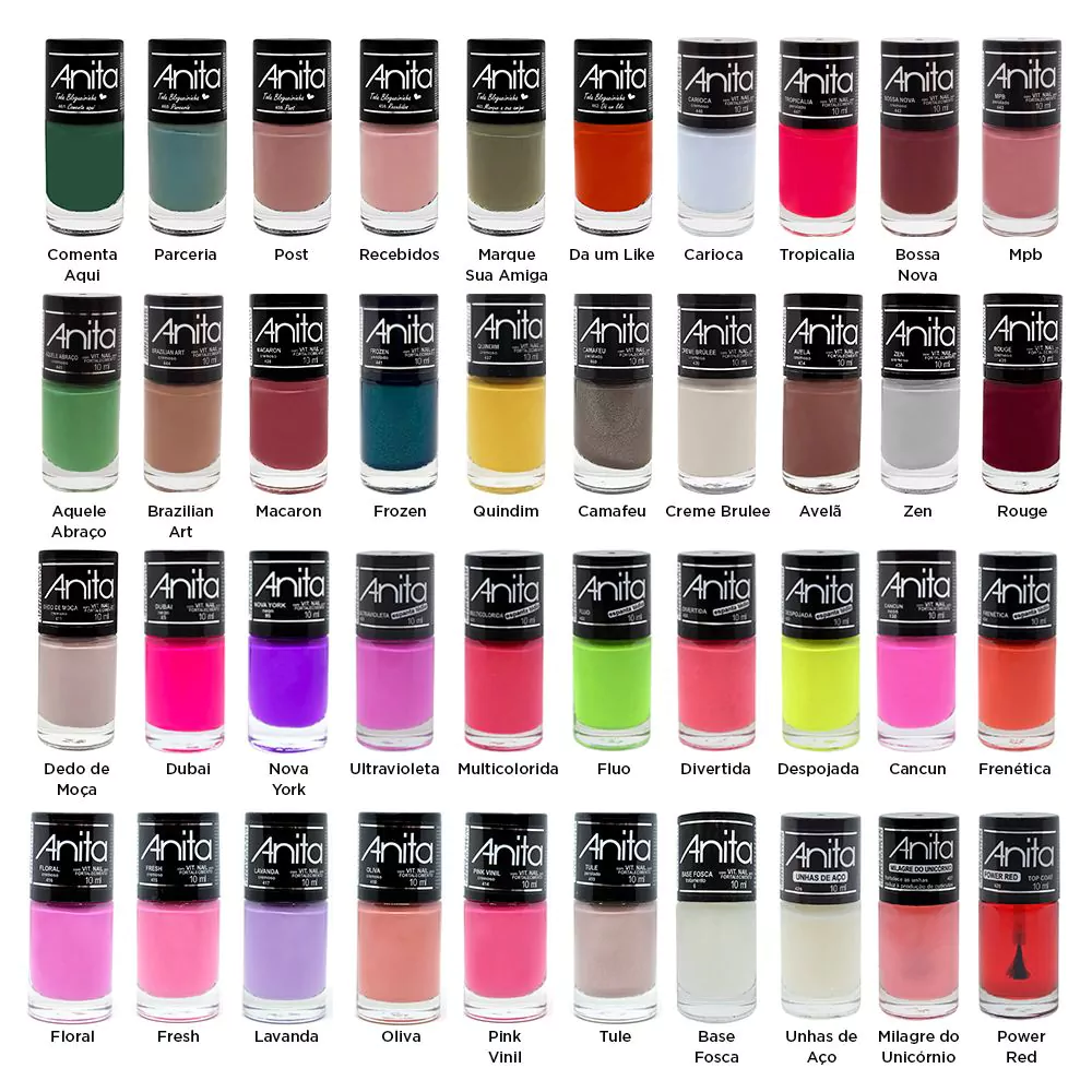 Com textura cremosa e brilho intenso, os esmaltes Anita oferecem alta cobertura, cores versáteis e secagem rápida. A seleção é totalmente personalizável, respeitando a quantidade mínima por cor, o que garante praticidade e flexibilidade no atendimento aos mais variados gostos.