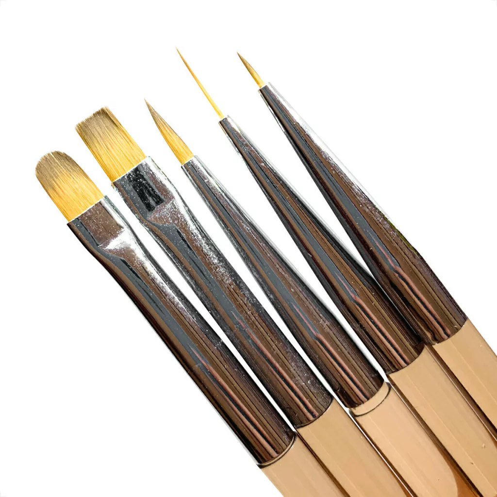 Jogo com 5 pincéis essenciais para quem deseja desenvolver com excelência a arte nas unhas.