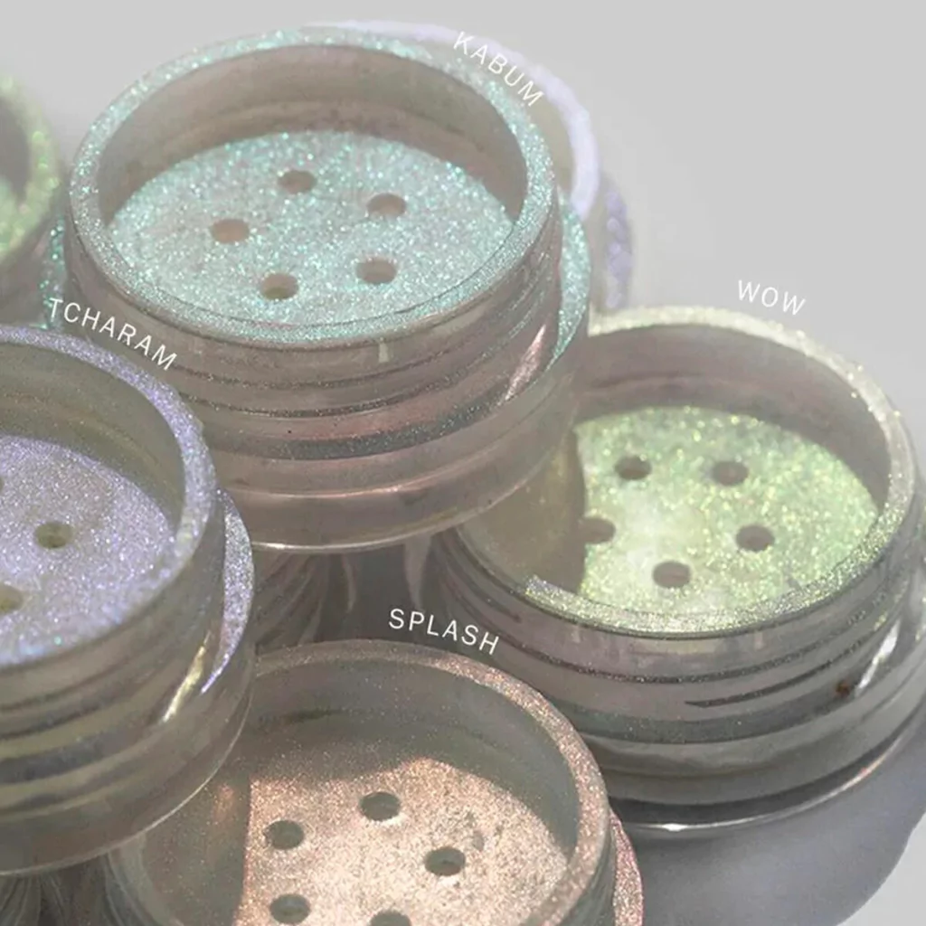 Pós cromados com reflexos multicoloridos e efeito espelhado. Com textura fina, o produto fica completamente nivelado quando aplicado. O Kit contém 4 cores com fundos e reflexos diferentes para te entregar muitas opções em mesa.