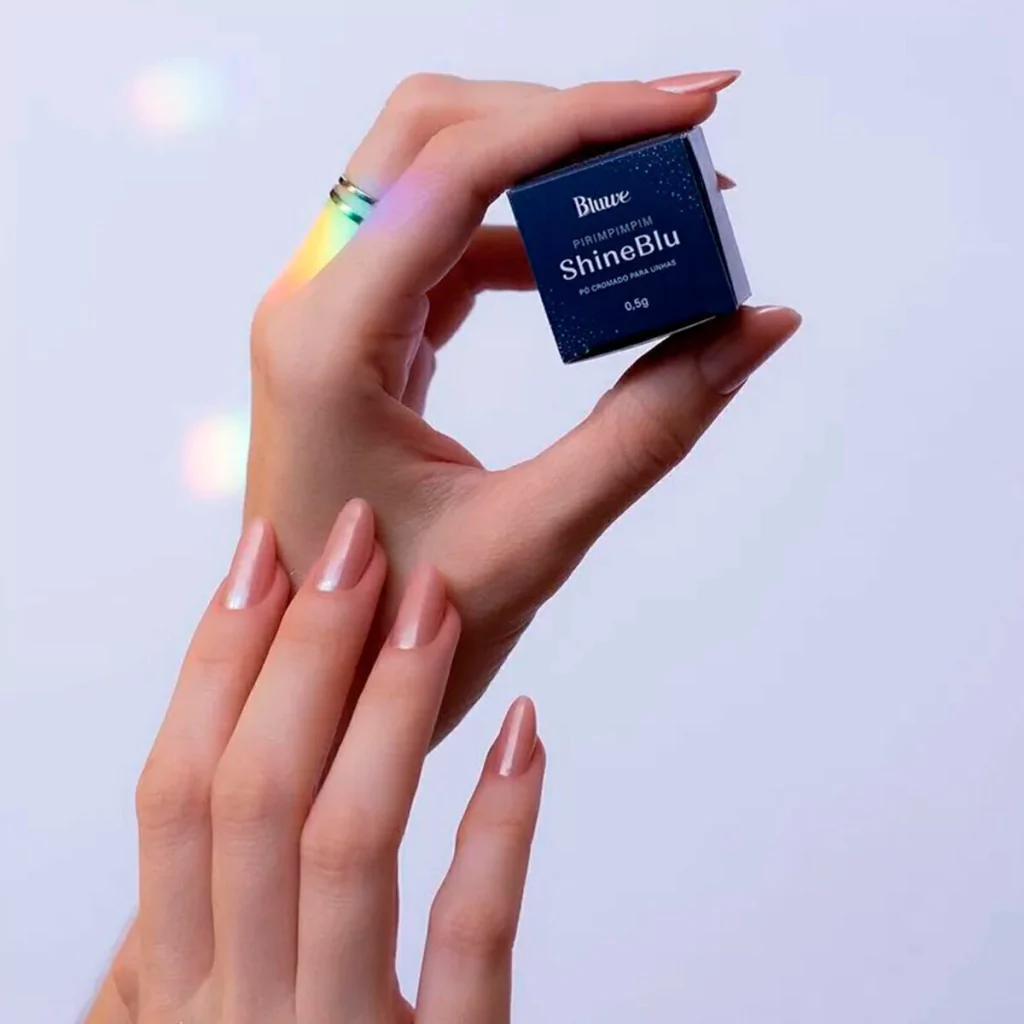 O Pó Cromado ShineBlu Cristal da Bluwe entrega um efeito perolado espelhado com acabamento fino e elegante. Sua fórmula translúcida e ultra fina permite uma aplicação nivelada e uniforme, ideal tanto para esmaltação completa quanto para detalhes em nail art.