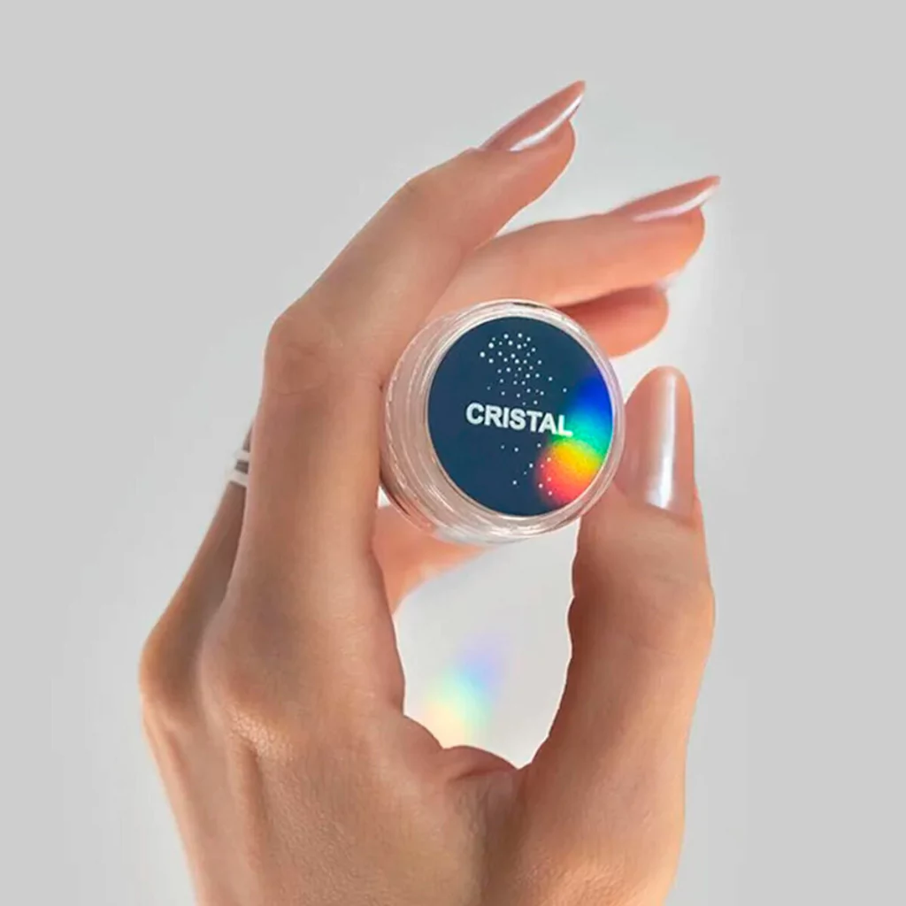 Com o Top Coat ainda quente, aplique o Pó Pirimpimpim Cristal esfregando suavemente até obter o efeito espelhado.