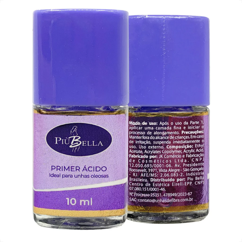 O Primer Ácido Piu Bella é essencial na preparação de unhas para alongamentos em gel, fibra de vidro, polygel, molde F1, esmaltação em gel e unhas acrílicas. Sua fórmula remove a oleosidade natural da lâmina ungueal, melhorando significativamente a aderência dos produtos e reduzindo o risco de descolamentos – especialmente em unhas oleosas.