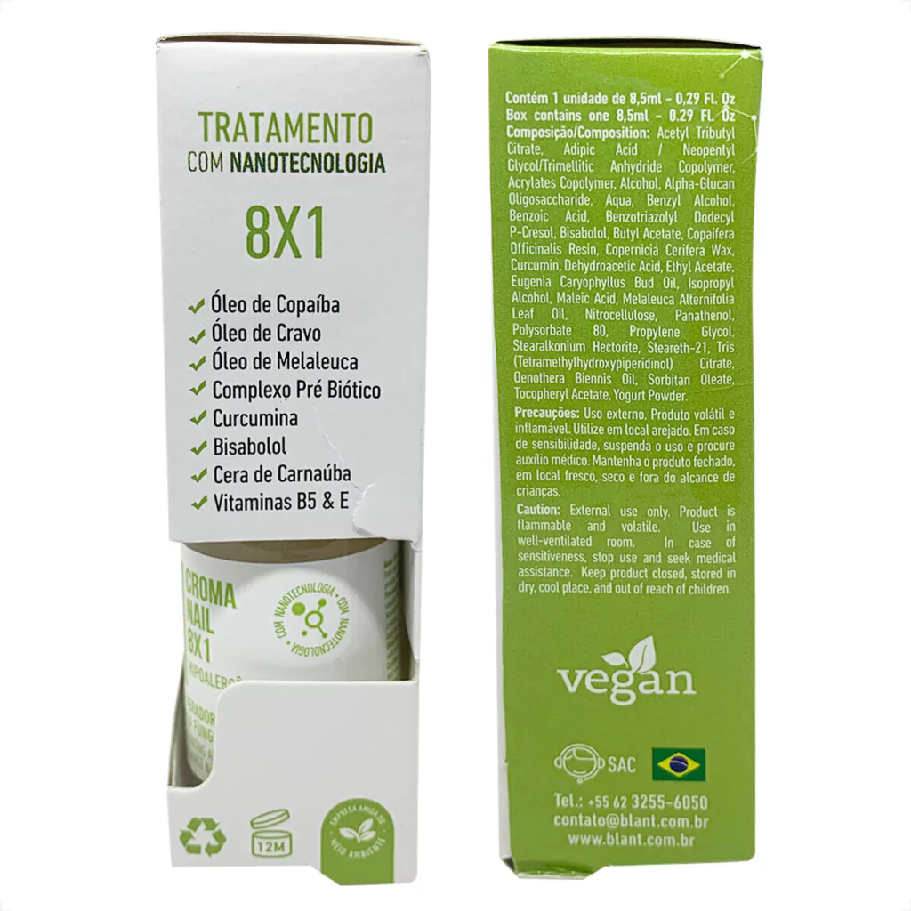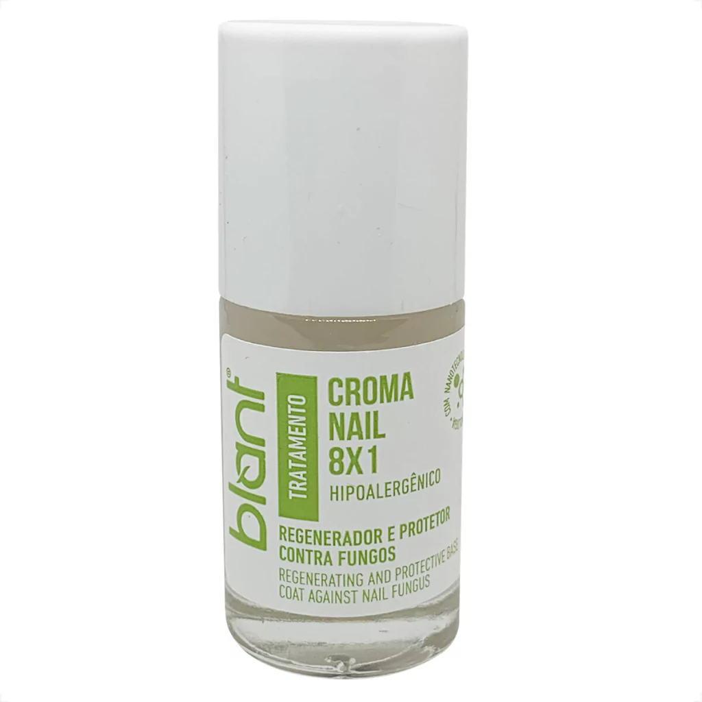 O Blant Croma Nail 8x1 é uma base regeneradora com ação intensiva no combate aos fungos e na recuperação de unhas danificadas. Com fórmula avançada e nanotecnologia, oferece proteção prolongada e múltiplos benefícios em um único produto.
